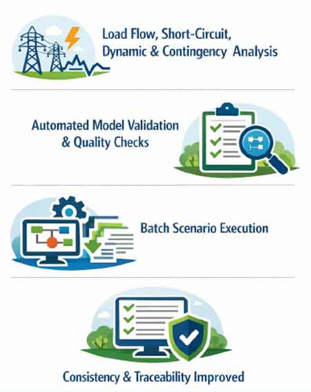 Power system simulation models grid behavior to analyze power flow, faults, stability, and system response under different operating conditions. It supports planning, validation, DER integration, and protection analysis without risking real infrastructure.